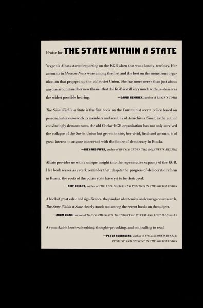 A popular study of the KGB and its post-Soviet incarnation by the courageous and opinionated Russian journalist Yevgenia Albats, who was among the first to report on the organization in the post-Soviet Russian press. Based on extensive personal interviews with current and former agents and on material from the KGB archives, The State Within a State makes a compelling argument that the new incarnation of the KGB has grown not only in size but in influence since the fall of the Soviet Union, making it perhaps the most powerful political force in contemporary Russia.