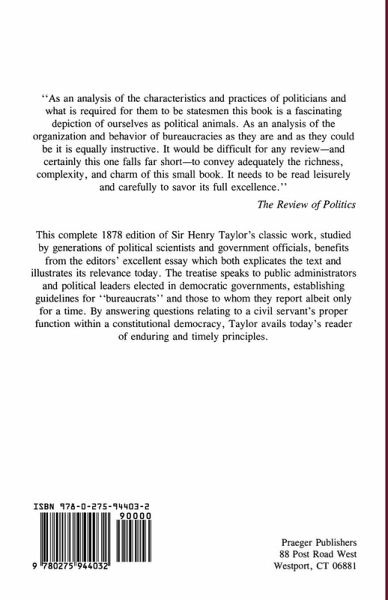 Sir Henry Taylor's classic treatise The Statesman, originally published in 1836, is the first modern book to be devoted to the subject of public administration. It has been read and studied by generations for its keen insights into the relationship between public administrators and elected officials in a democracy. It has also been appreciated for its wit. The present volume is the first twentieth-century edition to be based on the revised and expanded text that Taylor published in 1878 as part of his Collected Works. It is also the first edition to be fully annotated. The lengthy editors' introduction to this volume emphasizes the relevance of Taylor's thought to the fundamental issues of public administration in the contemporary United States. The editors demonstrate the superiority of Taylor's understanding of the relationship between politics and administration to the widely accepted model of that relation that derives from the thought of Woodrow Wilson. Above all, they argue, Taylor's insights merit our attention because they indicate how a properly organized civil service can be a locus of statesmanship in a democracy, fulfilling the intentions of the authors of the American Constitution in a contemporary context that differs significantly from what the Founders themselves anticipated.