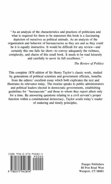 Preface Introduction: Sir Henry Taylor and the Study of Public Administration Concerning the Education of Youth destined for a Civil Career Of the Age at which Official and Parliamentary Life should commence A Statesman's most pregnant Function lies in the Choice and Use of Instruments On the Getting and Keeping of Adherents In the Choice of Men how far Literary Merit may be a Guide Of Official Style On the Inferences of Merit or Demerit from Popularity, and something concerning False Reputations Concerning Interviews Concerning the Conscience of a Statesman Concerning the Age at which a Statesman should marry, and what manner of Woman he should take to Wife Concerning the Effects of Order and the Maintenance of Equanimity Concerning certain Points of Practice On Official Criticism On the Arts of Rising On Quarrelling On the Ethics of Politics On Consistency in a Statesman On Secrecy On Ambition Concerning Rank as a Qualification for High Office On Decisiveness Concerning Reform of the Executive, and the Constitution of an Office or Establishment for Transacting the Business of a Minister Further respecting the Establishment of a Minister-Private Secretaries-Clerks Concerning Précis-writers, and Processes of Business On the Methods by which a Statesman can upon occasion get his Work done out of Doors On Parliamentary Interposition in Administrative Business On Aids to Legislation to be derived from Executive Experience Of the Manner in which able, and of the Manner in which indifferent Statesmen are deterred from availing themselves of able Service; and of the Evils which ensue from Men's Authority being in the inverse Ratio of their Abilities On the Administration of Patronage Concerning the Amusements of a Statesman On Manners Of Statesmen bred such, and of Statesmen bred in the Army, in the Navy, in Commerce, and at the Bar The Statesman out of Office Conclusion Notes Index