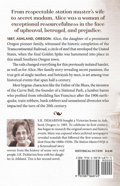 From respectable station master's wife to secret madam, Alice was a woman of exceptional resourcefulness in the the face of upheaval, betrayal, and prejudice. In 1887, Ashland, Oregon, this daughter of a prominent pioneer family, witnessed the historic completion of the United States Transcontinental Railroad, a circle of steel that enveloped the United States, when the final Golden Spike was hammered in to place in this small Southern Oregon town. The rails changed everything for this previously isolated hamlet, as well as for Alice. Her family story revealing secret passions, the true grit of a single mother, and betrayals by men, is set among true historical events that span half a century. Meet bygone characters like the Father of the Blues, the inventor of the Curve Ball, the founder of a National Park, a lumber baron who profited from rebuilding San Francisco after the 1906 earthquake, train robbers, bank robbers and sensational divorcees who impacted the turn of the 20th century.