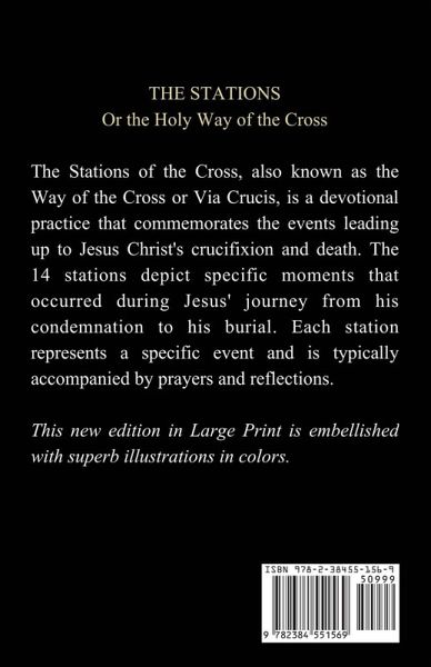 The Stations of the Cross, also known as the Way of the Cross or Via Crucis, is a devotional practice that commemorates the events leading up to Jesus Christ's crucifixion and death. The 14 stations depict specific moments that occurred during Jesus' journey from his condemnation to his burial. Each station represents a specific event and is typically accompanied by prayers and reflections. This new edition in Large Print is embellished with superb illustrations in colors.