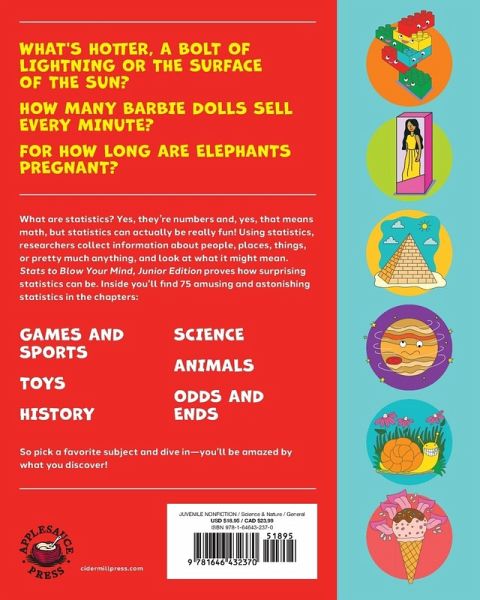 Did you know that the average person will walk about 110,000 miles in their lifetime, meaning you could walk around the Earth 4.5 times? Or that all the ants on Earth weigh about as much as all the humans? Learn more totally crazy facts with Stats to Blow Your Mind, Junior Edition. Did you know that the average person will walk about 110,000 miles in their lifetime, meaning you could walk around the Earth 4.5 times? Or that all the ants on Earth weigh about as much as all the humans? Learn more totally crazy facts with Stats to Blow Your Mind, Junior Edition. This book has 75 shocking stats and facts across a wide variety of topics, including the environment, the animal kingdom, cultures, languages, nature, science, people, poverty, media, technology, and more, such as: Glaciers and ice sheets hold about 69 percent of the world's freshwater. Indonesia is home to some of the shortest people in the world, with the average adult measuring in at around 5 feet, 1.8 inches. Four babies are born every second. McDonald's sells 75 burgers per second Sloths can hold their breath for up to 40 minutes. Prepare to be amazed, and impress your friends while you're at it! This highly visual book presents knowledge in an exciting way, and is perfect for curious minds that love to learn. Make learning engaging and fun with this graphic collection of some of the world's craziest, kid-friendly statistics.