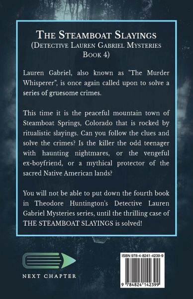 Lauren Gabriel, also known as "The Murder Whisperer", is once again called upon to solve a series of gruesome crimes. This time it is the peaceful mountain town of Steamboat Springs, Colorado that is rocked by ritualistic slayings. Can you follow the clues and solve the crimes? Is the killer the odd teenager with haunting nightmares, or the vengeful ex-boyfriend, or a mythical protector of the sacred Native American lands? You will not be able to put down the fourth book in Theodore Huntington's Detective Lauren Gabriel Mysteries series, until the thrilling case of THE STEAMBOAT SLAYINGS is solved!