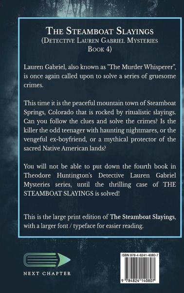 Lauren Gabriel, also known as "The Murder Whisperer", is once again called upon to solve a series of gruesome crimes. This time it is the peaceful mountain town of Steamboat Springs, Colorado that is rocked by ritualistic slayings. Can you follow the clues and solve the crimes? Is the killer the odd teenager with haunting nightmares, or the vengeful ex-boyfriend, or a mythical protector of the sacred Native American lands? You will not be able to put down the fourth book in Theodore Huntington's Detective Lauren Gabriel Mysteries series, until the thrilling case of THE STEAMBOAT SLAYINGS is solved! This is the large print edition of The Steamboat Slayings, with a larger font / typeface for easier reading.