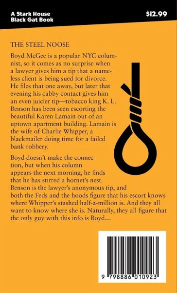 THE STEEL NOOSE Boyd McGee is a popular NYC columnist, so it comes as no surprise when a lawyer gives him a tip that a nameless client is being sued for divorce. He files that one away, but later that evening his cabby contact gives him an even juicier tip-tobacco king K. L. Benson has been seen escorting the beautiful Karen Lamain out of an uptown apartment building. Lamain is the wife of Charlie Whipper, a blackmailer doing time for a failed bank robbery. Boyd doesn't make the connection, but when his column appears the next morning, he finds that he has stirred a hornet's nest. Benson is the lawyer's anonymous tip, and both the Feds and the hoods figure that his escort knows where Whipper's stashed half-a-million is. And they all want to know where she is. Naturally, they all figure that the only guy with this info is Boyd... Black Gat Book #57.