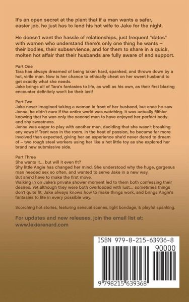 It's an open secret at the plant that if a man wants a safer, easier job, he just has to lend his hot wife to Jake for the night. He doesn't want the hassle of relationships, just frequent "dates" with women who understand there's only one thing he wants - their bodies, their subservience, and for them to share in a quick, molten hot affair that their husbands are fully aware of and support. Part One Tara has always dreamed of being taken hard, spanked, and thrown down by a hot, virile man. Now is her chance to ethically cheat on her sweet husband to get exactly what she needs. Jake brings all of Tara's fantasies to life, as well as his own, as their first blazing encounter definitely won't be their last! Part Two Jake never imagined taking a woman in front of her husband, but once he saw Jenna, he didn't care if the entire world was watching. It was actually filthier knowing that he was only the second man to have enjoyed her perfect body and shy sweetness. Jenna was eager to play with another man, deciding that she wasn't breaking any vows if Trent was in the room. In the heat of passion, he became far more involved than expected, giving her an experience she'd never dared to dream of - two rough steelworkers using her like a hot little toy as she explored her brand new submissive side. Part Three She wants it… but will it even fit? Shy little Angie has changed her mind. She understood why the huge, gorgeous man needed sex so often, and wanted to serve Jake in a new way. But she'd have to make the first move. Walking in on Jake's private shower moment led to them both confessing their desires. Yet although they were both overloaded with lust… sometimes things don't quite fit. Jake always knows how to make things work, and brings Angie's fantasies to life in every possible way. *** Scorching hot stories, featuring sensual scenes, light bondage, and playful spanking. Please look for the author's site for the email list.