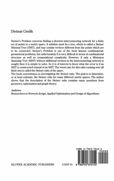The book concentrates on investigating the Steiner ratio. The goal is to determine, or at least estimate, the Steiner ratio for many different metric spaces. The author shows that the description of the Steiner ratio contains many questions from geometry, optimization, and graph theory.