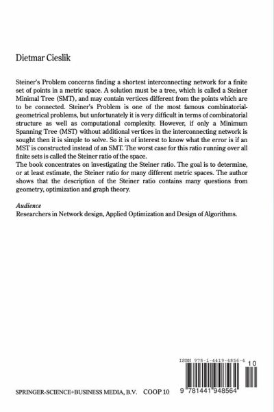 The book concentrates on investigating the Steiner ratio. The goal is to determine, or at least estimate, the Steiner ratio for many different metric spaces. The author shows that the description of the Steiner ratio contains many questions from geometry, optimization, and graph theory.