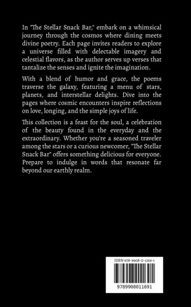 In "The Stellar Snack Bar," embark on a whimsical journey through the cosmos where dining meets divine poetry. Each page invites readers to explore a universe filled with delectable imagery and celestial flavors, as the author serves up verses that tantalize the senses and ignite the imagination. With a blend of humor and grace, the poems traverse the galaxy, featuring a menu of stars, planets, and interstellar delights. Dive into the pages where cosmic encounters inspire reflections on love, longing, and the simple joys of life. This collection is a feast for the soul, a celebration of the beauty found in the everyday and the extraordinary. Whether you're a seasoned traveler among the stars or a curious newcomer, "The Stellar Snack Bar" offers something delicious for everyone. Prepare to indulge in words that resonate far beyond our earthly realm.