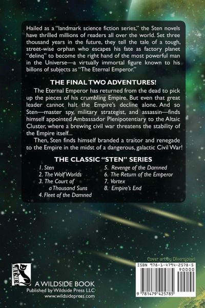 Hailed as a "landmark science fiction series," the Sten novels have thrilled millions of readers all over the world. Set three thousand years in the future, they tell the tale of a tough, street-wise orphan who escapes his fate as factory planet "delinq" to become the strong right-hand of the most powerful man in the Universe--a man hailed by his billons of subjects as "The Eternal Emperor." This mammoth volume collects the final 2 novels in the classic modern space opera series: VORTEX, and EMPIRE'S END. The Eternal Emperor has returned from the dead to pick up the pieces of his crumbling Empire. But even that great leader cannot halt the Empire’s decline alone. And so Sten -- master spy, military strategist, and assassin -- finds himself appointed Ambassador Plenipotentiary to the Altaic Cluster, where a brewing civil war threatens the stability of the Empire itself... Then, Sten finds himself branded a traitor and renegade to the Empire in the midst of a dangerous, galactic Civil War!