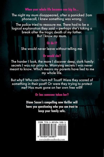 When your whole life becomes one big lie... The night my mum disappeared, after a panicked 3am phonecall, I knew something was wrong. The police tried to reassure me. There had to be a logical explanation they said - perhaps she's taking a break after the tragic death of my father. But I know my mum. Or do I? She would never leave without telling me. Or would she? The harder I look, the more I discover deep, dark family secrets I was not privy to. Worrying secrets I was never meant to know. Which means my parents have lied to me my whole life. But why? Who can I turn to? Trust? Were they scared of something in their past? Or were they trying to protect me? Has mum gone on her own free will? Or has someone taken her? Diane Saxon's compelling new thriller will have you questioning who you can trust to keep your family safe.