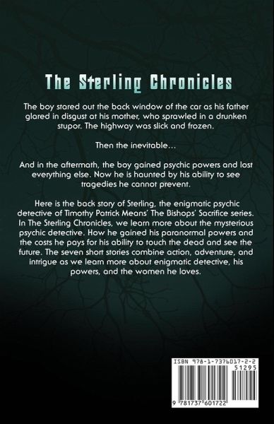 The boy stared out the back window of the car as his father glared in disgust at his mother, who sprawled in a drunken stupor. The highway was slick and frozen. Then the inevitable... And in the aftermath, the boy gained psychic powers and lost everything else. Now he is haunted by his ability to see tragedies he cannot prevent. Here is the back story of Sterling, the enigmatic psychic detective of Timothy Patrick Means' The Bishops' Sacrifice series. In The Sterling Chronicles, we learn more about the mysterious psychic detective, how he gained his paranormal powers, and the costs he pays for his ability to touch the dead and see the future. The seven short stories combine action, adventure, and intrigue as we learn more about an enigmatic detective, his powers, and the women he loves.