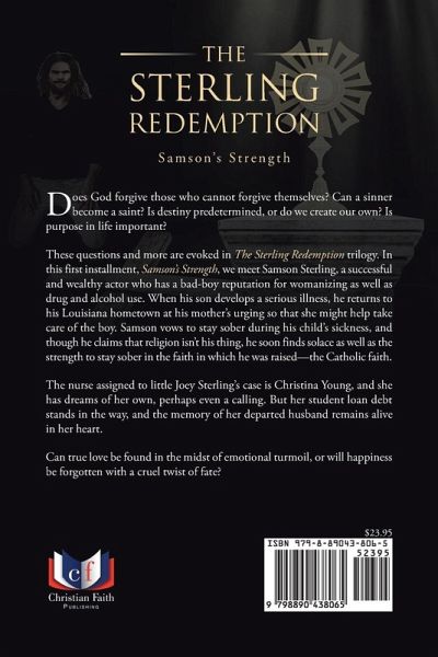 Does God forgive those who cannot forgive themselves? Can a sinner become a saint? Is destiny predetermined, or do we create our own? Is purpose in life important? These questions and more are evoked in The Sterling Redemption trilogy. In this first installment, Samson's Strength, we meet Samson Sterling, a successful and wealthy actor who has a bad-boy reputation for womanizing as well as drug and alcohol use. When his son develops a serious illness, he returns to his Louisiana hometown at his mother's urging so that she might help take care of the boy. Samson vows to stay sober during his child's sickness, and though he claims that religion isn't his thing, he soon finds solace as well as the strength to stay sober in the faith in which he was raised--the Catholic faith. The nurse assigned to little Joey Sterling's case is Christina Young, and she has dreams of her own, perhaps even a calling. But her student loan debt stands in the way, and the memory of her departed husband remains alive in her heart. Can true love be found in the midst of emotional turmoil, or will happiness be forgotten with a cruel twist of fate?