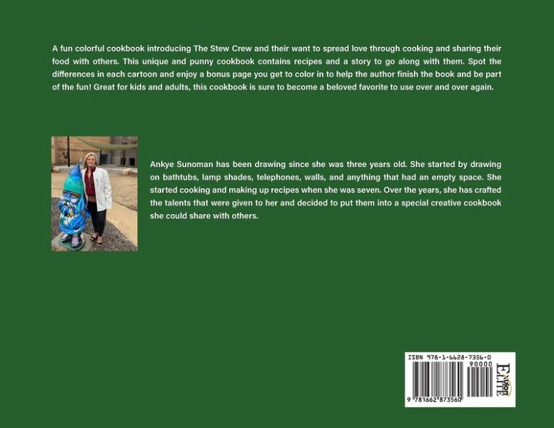 A fun colorful cookbook introducing The Stew Crew and their want to spread love through cooking and sharing their food with others. This unique and punny cookbook contains recipes and a story to go along with them. Spot the differences in each cartoon and enjoy a bonus page you get to color in to help the author finish the book and be part of the fun! Great for kids and adults, this cookbook is sure to become a beloved favorite to use over and over again. Ankye Sunoman has been drawing since she was three years old. She started by drawing on bathtubs, lamp shades, telephones, walls, and anything that had an empty space. She started cooking and making up recipes when she was seven. Over the years, she has crafted the talents that were given to her and decided to put them into a special creative cookbook she could share with others.