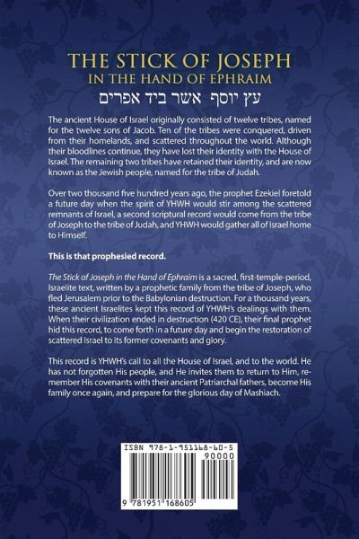 The ancient House of Israel consisted of 12 families, or tribes, named for the 12 sons of Jacob (Israel). Ten of those tribes were conquered, driven from their homelands, and scattered throughout the world. Although their bloodlines continue, they have lost their identity with the House of Israel. The remaining two tribes have retained their identity, and are now known as the Jewish people, named for the tribe of Judah. Over 2500 years ago, the prophet Ezekiel foretold a day when the spirit of YHWH would stir the scattered remnants of Israel and restore them to life (Ezekiel 37:11-14). He also prophesied of a second scriptural record to come forth from the tribe of Joseph to Judah, in the hand of Joseph's son, Ephraim. This is that prophesied record. The Stick of Joseph in the Hand of Ephraimis a sacred, first-temple-period, Israelite text, written by a prophetic family from the tribe of Joseph, who fled Jerusalem in 601 BCE. YHWH led them for years in the wilderness and finally brought them "over the wall" to ancient America, in fulfillment of Jacob's final blessing to Joseph. (Genesis 49:22) For 1,000 years, these ancient Israelites kept sacred records. When their civilization ended in destruction (420 CE), their final prophet, M'roni, hid this record in the ground, to come forth in the future for the prophesied restoration of scattered Israel to its former glory. This record is all of the following unique and extraordinary things: • The shofar sounding to scattered Israel as YHWH's final attempt to gather His people; • A dire warning to the USA and a cry of repentance to the state of Israel. Any nation that does not honor the God of Israel will not survive; • An independent witness of the prophets, Mashiach, and the covenants given by YHWH to Israel; • A record of the means whereby all mankind can, as Moses, ascend to stand in the presence of YHWH; • An invitation to believe and receive the promises YHWH extends to those who will be His people. This is the only Hebrew Messianic/ascension document in existence that has not been influenced by entanglements with Babylon, Greece, or Rome, because those who kept the record left Jerusalem and the Eastern Hemisphere prior to the Babylonian captivity. It is the most sublime and direct Jewish ascension text available. This annotated Hebrew-roots English edition restores the ancient Hebraic nature of the record, to provide a clear understanding of Israel's God, His work now underway, and the coming age of Mashiach. Whether you study religion in the Torah, Tanakh, Talmud, NIV Bible, Zohar, New Testament, Book of Mormon, Catholic writings, LDS scriptures, biblical commentary, or other holy books, this volume will inspire you to greater prophetic literacy, gifts in spirituality, understanding of history and theology, and most importantly, immerse your soul in a conversation and relationship with that God who loves, forgives, guides, and reconnects honest searchers with the tree of life. The Stick of Joseph is a greater discovery than the Dead Sea Scrolls or the Nag Hammadi library, though it has received far less attention. It is the preeminent Messianic document in the world, untwisting the false Greek caricature known as Jesus Christ of Nazareth. It restores the basics of the complete ancient Israelite faith and culture largely absent from modern, rabbinic Judaism. The ten commandments, temples, altars, Passover, the law of Moses, patterns, evidence, and much lost understanding all come together in this invaluable journal-record of wandering Israeli Hebrews who founded a great civilization.
