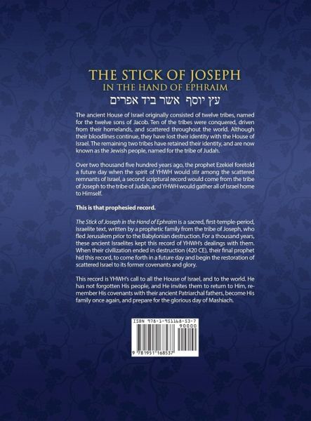 The ancient House of Israel consisted of 12 families, or tribes, named for the 12 sons of Jacob (Israel). Ten of those tribes were conquered, driven from their homelands, and scattered throughout the world. Although their bloodlines continue, they have lost their identity with the House of Israel. The remaining two tribes have retained their identity, and are now known as the Jewish people, named for the tribe of Judah. Over 2500 years ago, the prophet Ezekiel foretold a day when the spirit of YHWH would stir the scattered remnants of Israel and restore them to life (Ezekiel 37:11-14). He also prophesied of a second scriptural record to come forth from the tribe of Joseph to Judah, in the hand of Joseph’s son, Ephraim. This is that prophesied record. The Stick of Joseph in the Hand of Ephraimis a sacred, first-temple-period, Israelite text, written by a prophetic family from the tribe of Joseph, who fled Jerusalem in 601 BCE. YHWH led them for years in the wilderness and finally brought them "over the wall" to ancient America, in fulfillment of Jacob’s final blessing to Joseph. (Genesis 49:22) For 1,000 years, these ancient Israelites kept sacred records. When their civilization ended in destruction (420 CE), their final prophet, M’roni, hid this record in the ground, to come forth in the future for the prophesied restoration of scattered Israel to its former glory. This record is all of the following unique and extraordinary things: • The shofar sounding to scattered Israel as YHWH’s final attempt to gather His people; • A dire warning to the USA and a cry of repentance to the state of Israel. Any nation that does not honor the God of Israel will not survive; • An independent witness of the prophets, Mashiach, and the covenants given by YHWH to Israel; • A record of the means whereby all mankind can, as Moses, ascend to stand in the presence of YHWH; • An invitation to believe and receive the promises YHWH extends to those who will be His people. This is the only Hebrew Messianic/ascension document in existence that has not been influenced by entanglements with Babylon, Greece, or Rome, because those who kept the record left Jerusalem and the Eastern Hemisphere prior to the Babylonian captivity. It is the most sublime and direct Jewish ascension text available. This annotated Hebrew-roots English edition restores the ancient Hebraic nature of the record, to provide a clear understanding of Israel’s God, His work now underway, and the coming age of Mashiach. Whether you study religion in the Torah, Tanakh, Talmud, NIV Bible, Zohar, New Testament, Book of Mormon, Catholic writings, LDS scriptures, biblical commentary, or other holy books, this volume will inspire you to greater prophetic literacy, gifts in spirituality, understanding of history and theology, and most importantly, immerse your soul in a conversation and relationship with that God who loves, forgives, guides, and reconnects honest searchers with the tree of life. The Stick of Joseph is a greater discovery than the Dead Sea Scrolls or the Nag Hammadi library, though it has received far less attention. It is the preeminent Messianic document in the world, untwisting the false Greek caricature known as Jesus Christ of Nazareth. It restores the basics of the complete ancient Israelite faith and culture largely absent from modern, rabbinic Judaism. The ten commandments, temples, altars, Passover, the law of Moses, patterns, evidence, and much lost understanding all come together in this invaluable journal-record of wandering Israeli Hebrews who founded a great civilization.