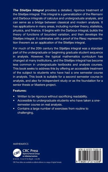 This book provides a detailed, rigorous treatment of the Stieltjes integral. It offers an accessible treatment of the subject to students who have had a one semester course in analysis. This book is suitable for a second semester course in analysis, and also for independent study or as the foundation for a senior thesis or Masters project.