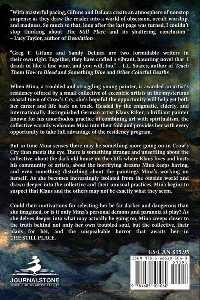 "With masterful pacing, Gifune and DeLuca create an atmosphere of nonstop suspense as they draw the reader into a world of obsession, occult worship, and madness. So much so that, long after the last page was turned, I couldn't stop thinking about The Still Place and its shattering conclusion." -Lucy Taylor, author of Desolation "Greg F. Gifune and Sandy DeLuca are two formidable writers in their own right. Together, they have crafted a vibrant, haunting novel that I drank in like a fine wine, and you will, too." - L.L. Soares, author of Teach Them How to Bleed and Something Blue and Other Colorful Deaths When Mina, a troubled and struggling young painter, is awarded an artist's residency offered by a small collective of eccentric artists in the mysterious coastal town of Crow's Cry, she's hopeful the opportunity will help get both her career and life back on track. Headed by the enigmatic, elderly, and internationally distinguished German artist Klaus Riker, a brilliant painter known for his unorthodox practice of combining art with spiritualism, the collective warmly welcomes Mina into their fold and provides her with every opportunity to take full advantage of the residency program. But in time Mina senses there may be something more going on in Crow's Cry than meets the eye. There is something strange and unsettling about the collective, about the dark old house on the cliffs where Klaus lives and hosts his community of artists, about the horrifying dreams Mina keeps having, and even something disturbing about the paintings Mina's working on herself. As she becomes increasingly isolated from the outside world and drawn deeper into the collective and their unusual practices, Mina begins to suspect that Klaus and the others may not be exactly what they seem. Could their motivations for selecting her be far darker and dangerous than she imagined, or is it only Mina's personal demons and paranoia at play? As she delves deeper into what may actually be going on, Mina creeps closer to the truth behind not only her own troubled soul, but the collective, their plans for her, and the unspeakable horror that awaits her in THE STILL PLACE.