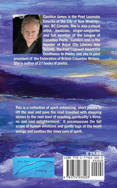 This is Poet Laureate Emerita, Candice James' 27th book of poetry. It is a collection of spirit enhancing, short poems to lift the soul and pave the road travelled with steppingstones to the next level of reaching spirituality's Nirvana and soul enlightenment. It encompasses the full scope of human emotions and gently tugs at the strings of the heart and soothes the inner core of spirit