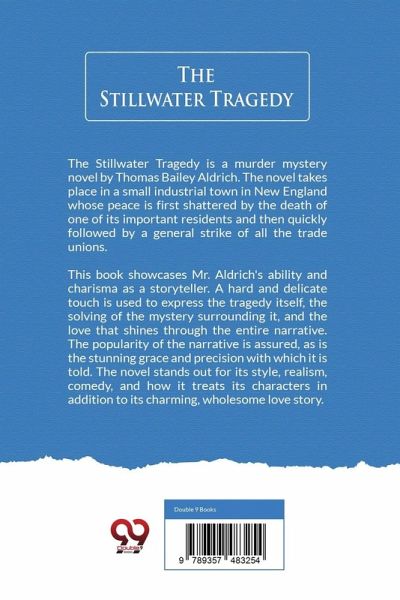 The Stillwater Tragedy is a murder mystery novel by Thomas Bailey Aldrich. The novel takes place in a small industrial town in New England whose peace is first shattered by the death of one of its important residents and then quickly followed by a general strike of all the trade unions. This book showcases Mr. Aldrich's ability and charisma as a storyteller. A hard and delicate touch is used to express the tragedy itself, the solving of the mystery surrounding it, and the love that shines through the entire narrative. The popularity of the narrative is assured, as is the stunning grace and precision with which it is told. The novel stands out for its style, realism, comedy, and how it treats its characters in addition to its charming, wholesome love story.