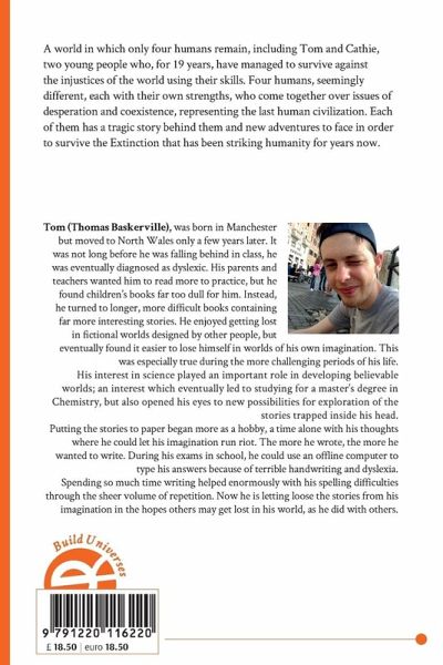 A world in which only four humans remain, including Tom and Cathie, two young people who, for 19 years, have managed to survive against the injustices of the world using their skills. Four humans, seemingly different, each with their own strengths, who come together over issues of desperation and coexistence, representing the last human civilization. Each of them has a tragic story behind them and new adventures to face in order to survive the Extinction that has been striking humanity for years now. Tom (Thomas Baskerville), was born in Manchester but moved to North Wales only a few years later. It was not long before he was falling behind in class, he was eventually diagnosed as dyslexic. His parents and teachers wanted him to read more to practice, but he found children's books far too dull for him. Instead, he turned to longer, more difficult books containing far more interesting stories. He enjoyed getting lost in fictional worlds designed by other people, but eventually found it easier to lose himself in worlds of his own imagination. This was especially true during the more challenging periods of his life. His interest in science played an important role in developing believable worlds; an interest which eventually led to studying for a master's degree in Chemistry, but also opened his eyes to new possibilities for exploration of the stories trapped inside his head. Putting the stories to paper began more as a hobby, a time alone with his thoughts where he could let his imagination run riot. The more he wrote, the more he wanted to write. During his exams in school, he could use an offline computer to type his answers because of terrible handwriting and dyslexia. Spending so much time writing helped enormously with his spelling difficulties through the sheer volume of repetition. Now he is letting loose the stories from his imagination in the hopes others may get lost in his world, as he did with others.