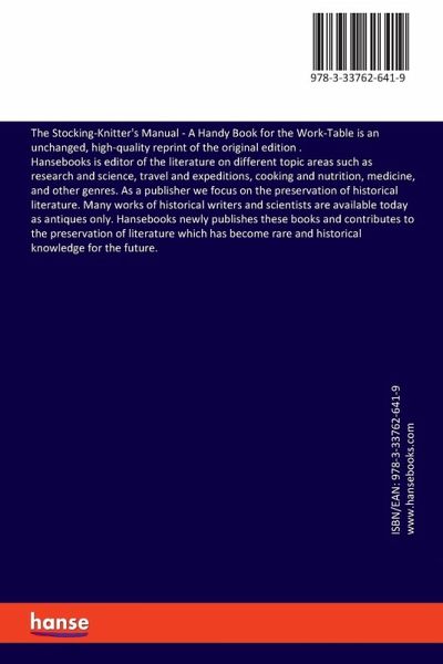 The Stocking-Knitter's Manual - A Handy Book for the Work-Table is an unchanged, high-quality reprint of the original edition .Hansebooks is editor of the literature on different topic areas such as research and science, travel and expeditions, cooking and nutrition, medicine, and other genres. As a publisher we focus on the preservation of historical literature. Many works of historical writers and scientists are available today as antiques only. Hansebooks newly publishes these books and contributes to the preservation of literature which has become rare and historical knowledge for the future.