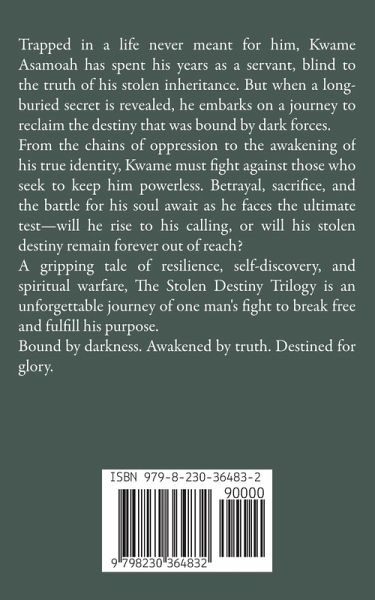 Trapped in a life never meant for him, Kwame Asamoah has spent his years as a servant, blind to the truth of his stolen inheritance. But when a long-buried secret is revealed, he embarks on a journey to reclaim the destiny that was bound by dark forces. From the chains of oppression to the awakening of his true identity, Kwame must fight against those who seek to keep him powerless. Betrayal, sacrifice, and the battle for his soul await as he faces the ultimate test-will he rise to his calling, or will his stolen destiny remain forever out of reach? A gripping tale of resilience, self-discovery, and spiritual warfare, The Stolen Destiny Trilogy is an unforgettable journey of one man's fight to break free and fulfill his purpose. Bound by darkness. Awakened by truth. Destined for glory.
