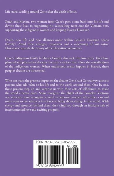 Life starts swirling around Gene after the death of Jesus. Sarah and Maxine, two women from Gene's past, come back into his life and devote their lives to supporting his causes-long term care for Vietnam vets, supporting the indigenous women and keeping Hawaii Hawaiian. Death, new life, and new alliances occur within Leilani's Hawaiian ohana (family). Amid these changes, expansion and a welcoming of lost native Hawaiian's expands the beauty of the Hawaiian community. Gene's indigenous family in Shasta County also rock this love story. They have planned and plotted for decades to create a society that values the contributions of the indigenous women. When unplanned events happen in Hawaii, these people's dreams are threatened. Who can make the greatest impact on the dreams Gene has? Gene always attracts persons who add value to his life and to the world around them. One by one, these persons step up and surprise us with their acts of selflessness to make the world a better place. Some recognize the plight of the homeless Vietnam war veterans, some recognize a need to empower women where they can and some want to use advances in science to bring about change in the world. With energy and resources behind them, they wind us through an intricate web of interconnected love and exciting progress.