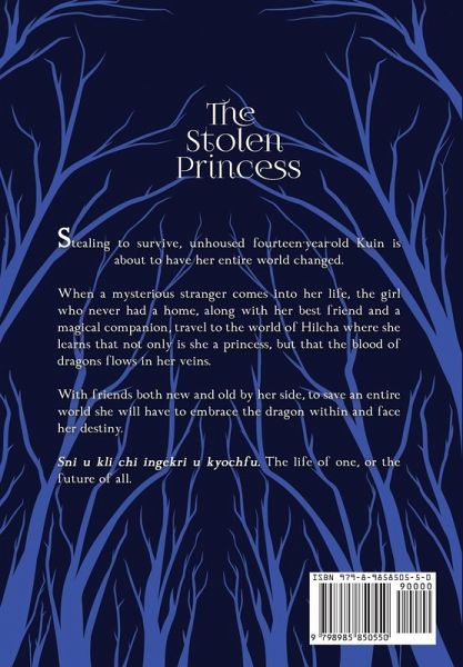 Stealing to survive, unhoused fourteen-year-old Kuin is about to have her entire world changed. When a mysterious stranger comes into her life, the girl who never had a home, along with her best friend and a magical companion, travel to the world of Hilcha where she learns that not only is she a princess, but that the blood of dragons flows in her veins. With friends both new and old by her side, to save an entire world she will have to embrace the dragon within and face her destiny. Sni u kli chi ingekri u kyochfu. The life of one, or the future of all.