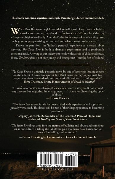 When Ben Brickman and Dave McConnell learn of each other’s hidden sexual abuse trauma, they decide to confront their demons by abducting a dangerous high school bully. After their plan for revenge takes a shocking turn, the boys must grapple with good and evil and what it means to be a man. Drawn in part from the author's personal experience as a sexual abuse survivor, The Stone Boys is a both a dramatic page-turner and a profoundly emotional read. Arriving as our society contends with a crisis of childhood sexual abuse, The Stone Boys is not only timely and courageous -- but the first of its kind. Praise for THE STONE BOYS: "Gripping . . . An example of gritty realism. Recommended for mature students." --School Library Journal "Gurian incorporates autobiographical elements into a story built not around easy answers but anguished inner arguments . . . of use for discussing the cycle of abuse." --Kirkus Reviews "The Stone Boys is a uniquely powerful novel by one of America's leading experts on the subject of boys. Protagonist Ben Brickman's journey to deal with his deepest emotions is relentlessly and authentically written . . . unforgettable." --Terry Trueman, Printz Honor Author of Stuck in Neutral "The Stone Boys makes it safe for boys to deal with experiences and topics not usually verbalized. This book will be part of their shaping journey to becoming good men." --Gregory Jantz, Ph.D., founder of The Center, A Place of Hope, and author of Healing the Scars of Emotional Abuse "The Stone Boys is unlike any other YA novel . . . a page turner . . . it can lead to discussions about any trauma one is dealing with." --Tina Reed, medium.com "The Stone Boys dives deep into the trauma of bullying and abuse and comes out just as our culture is taking the lid off the pain too many have buried for too long. Compelling and profound." --Pastor Tim Wright, Community of Grace Lutheran Church "Michael Gurian masterfully tackles this difficult subject as he portrays the awkwardness, confusion, and shame the two boys endure . . . This is an important book that should be read and discussed by boys and men, and by anyone who loves a boy or a man." --Barbara Mulvey Little, Author of The Secrets Underneath