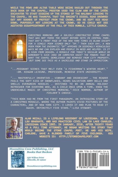 While the pews and altar table were hauled out through the back door of the chapel, Preston used the claw arm of the 1400K Excavator to start digging up the stones of the walkway leading to the chapel . He was thankful that the engine's diesel roar drowned out any sounds of protest from the crowd, and he kept his head down, purposely not looking at the crowd, so he could not see agitated disappointment at the fall of this humble, little church. IN A CITY FILLED WITH DROWNING, DESPERATE SOULS, DARRAGH FINN, A DRUNKARD, FELON AND ATHEIST, BECOMES THEIR UNLIKELY HAND OF DELIVERANCE. Christmas morning and a solidly constructed stone chapel that was not there the night before sets in Central Park. That day's front page of the New York Times is blank except for a single poem signed only "df." Then each day, a new poem from the enigmatic "df" appears in seemingly miraculous ways no one can explain and people in need are helped. Is it a sign from heaven, a miracle for today's secular world or somebody's sick joke or computer hack? The powers that be want the chapel demolished and removed from city property, but some see this as a sacrilege and stand in opposition. "The Stone Chapel Poet, McCall's masterfully inventive debut novel, is as vibrant and iridescent as the stained glass windows adorning the small chapel discovered Christmas morning on the lawn of Central Park. Poignant poetry, which appears simultaneously and just as inexplicably to usurp the front page of New York Times, becomes the loom weaving together the tattered threads of four desperate lives, shredded by the frozen winds of loneliness. Jaded New Yorker's are left to wonder whether the chapel and the poetry are Christmas miracles or simply unconventional graffiti. McCall subtly waves his pen and the reader feels the soft kiss of snowflakes, hears Salvation Army bells and smells evergreen needles, transported viscerally to that place in us all where memories of our favorite Christmases past reside. McCall reminds us that the threads connecting humanity are love and, wherever there is love, there is the intention of Christmas. As Cap Kencaid, McCall's ill-fated fisherman reveals, Christmas, at its best, is not a season but an inexhaustible series of lifelines that can be used to salvage the overwhelmed." As elegant as it is powerful, The Stone Chapel Poet is destined to be an annual holiday refresher for everyone who, as a child once upon a time, knew the undeniable magic of Christmas morning."-Rick Norman, author of Fielder's Choice. "This book had me from the first paragraph. An intriguing story of a Christmas miracle, where the author paints vivid pictures of the characters, and of New York City. I loved it and plan to read it again. Definitely five stars."-Lisa Stewart. "What is the difference between believing in existence and believing in life? The Stone Chapel Poet takes us on a mysterious journey that offers an answer to that question, and as it does, H. Alan McCall balances deft storytelling that keeps you turning the page with poignant scenes that melt even 'a fisherman's winter heart.' By the story's end, you'll be reminded that so much of life's pilgrimage begins with a willingness to walk beyond the unseen."-Dr. Keagan LeJeune, Professor, McNeese State University.