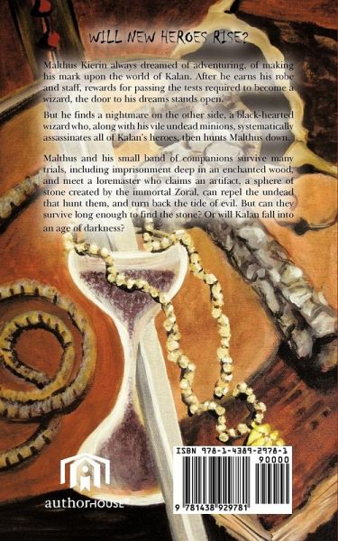 Malthus Kierin always dreamed of adventuring, of making his mark upon the world of Kalan. After he earns his robe and staff, rewards for passing the tests required to become a wizard, the door to his dreams stands open. But he finds a nightmare on the other side, a black-hearted wizard who, along with his vile undead minions, systematically assassinates all of Kalan's heroes, then hunts Malthus down. Malthus and his small band of companions survive many trials, including imprisonment deep in an enchanted wood, and meet a loremaster who claims an artifact, a sphere of stone created by the immortal Zoral, can repel the undead that hunt them, and turn back the tide of evil. But can they survive long enough to find the stone? Or will Kalan fall into an age of darkness?