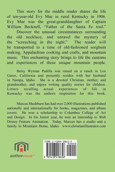 This story for the middle reader shares the life of ten-year-old Evy Mae in rural Kentucky in 1906. Evy Mae was the great-granddaughter of Captain William Becknell, "Father of the Santa Fe trail." Discover the unusual circumstances surrounding the old necklace, and unravel the mystery of the "screeching in the night." The reader will be transported to a time of old-fashioned sorghum making, Appalachian cooking and crafts, and mountain music. This enchanting story brings to life the customs and experiences of these unique mountain people.