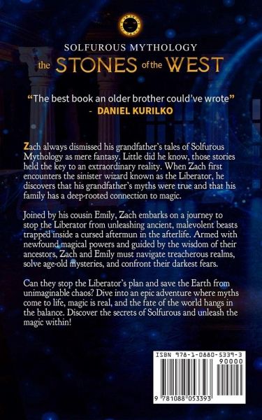 Zach always dismissed his grandfather's tales of Solfurous Mythology as mere fantasy. Little did he know, those stories held the key to an extraordinary reality. When Zach first encounters the sinister wizard known as the Liberator, he discovers that his grandfather's myths were true and that his family has a deep-rooted connection to magic. Joined by his cousin Emily, Zach embarks on a journey to stop the Liberator from unleashing ancient, malevolent beasts trapped inside a cursed aftermun in the afterlife. Armed with newfound magical powers and guided by the wisdom of their ancestors, Zach and Emily must navigate treacherous realms, solve age-old mysteries, and confront their darkest fears. Can they stop the Liberator's plan and save the Earth from unimaginable chaos? Dive into an epic adventure where myths come to life, magic is real, and the fate of the world hangs in the balance. Discover the secrets of Solfurous and unleash the magic within! "The best book an older brother could've wrote" - Daniel Kurilko Have you ever wanted to view the world through the lens of creativity and imagination that you once held as a child? The joy the first time you read the Percy Jackson or Harry Potter series? Zach and Emily will take you along that journey in this book. Reasons to supportThe original manuscript to this book was written while I was in 6th grade. I released the book with big dreams as my childhood ran wild with the tale. Recently as an adult I picked up the original 160 page manuscript with the goal of proofreading and editing the contents to allow the story to flow and be well structured while still containing the creativity and imagination of a child. If you want to support a teen author and feel your imagination come to life like never before, pick this one up! This book is part one of the Solfurous Mythology series. Book two is on the way!