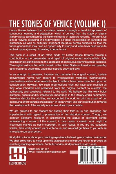 The Stones Of Venice (Volume I): Volume I - The Foundations This book is a result of an effort made by us towards making a contribution to the preservation and repair of original classic literature. In an attempt to preserve, improve and recreate the original content, we have worked towards: 1. Type-setting & Reformatting: The complete work has been re-designed via professional layout, formatting and type-setting tools to re-create the same edition with rich typography, graphics, high quality images, and table elements, giving our readers the feel of holding a 'fresh and newly' reprinted and/or revised edition, as opposed to other scanned & printed (Optical Character Recognition - OCR) reproductions. 2. Correction of imperfections: As the work was re-created from the scratch, therefore, it was vetted to rectify certain conventional norms with regard to typographical mistakes, hyphenations, punctuations, blurred images, missing content/pages, and/or other related subject matters, upon our consideration. Every attempt was made to rectify the imperfections related to omitted constructs in the original edition via other references. However, a few of such imperfections which could not be rectified due to intentional\unintentional omission of content in the original edition, were inherited and preserved from the original work to maintain the authenticity and construct, relevant to the work. We believe that this work holds historical, cultural and/or intellectual importance in the literary works community, therefore despite the oddities, we accounted the work for print as a part of our continuing effort towards preservation of literary work and our contribution towards the development of the society as a whole, driven by our beliefs. We are grateful to our readers for putting their faith in us and accepting our imperfections with regard to preservation of the historical content. HAPPY READING!