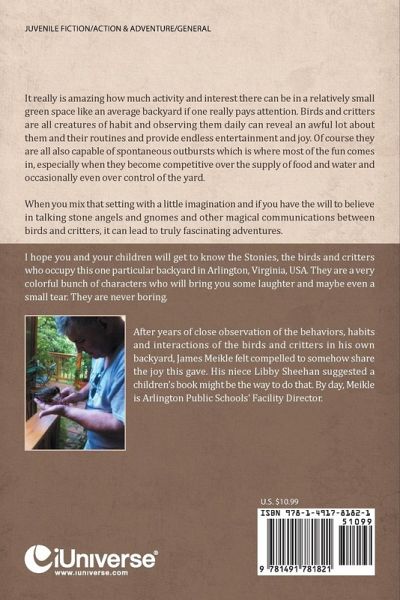 It really is amazing how much activity and interest there can be in a relatively small green space like an average backyard if one really pays attention. Birds and critters are all creatures of habit and observing them daily can reveal an awful lot about them and their routines and provide endless entertainment and joy. Of course they are all also capable of spontaneous outbursts which is where most of the fun comes in, especially when they become competitive over the supply of food and water and occasionally even over control of the yard. When you mix that setting with a little imagination and if you have the will to believe in talking stone angels and gnomes and other magical communications between birds and critters, it can lead to truly fascinating adventures. I hope you and your children will get to know the Stonies, the birds and critters who occupy this one particular backyard in Arlington, Virginia, USA. They are a very colorful bunch of characters who will bring you some laughter and maybe even a small tear. They are never boring.