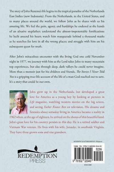 The story of John Rozema's life begins in the tropical paradise of the Netherlands East Indies (now Indonesia). From the Netherlands, to the United States, and to many places around the world, we follow John as he shares with us his amazing life. We feel the pain, agony, and hardships he endured at the hands of an abusive stepfather; understand the almost-impenetrable fortifications he built around his heart; watch him masquerade behind a thousand masks as he searches for love in all the wrong places; and struggle with him on his subsequent quest for truth. After John's miraculous encounter with the living God one cold November night in 1977, we journey with him as the Lord takes John to many mountain top experiences, but also through deep, dark valleys he could never imagine. More than a memoir just for his children and friends, "The Stories I Never Told You" is a gripping true-life account of the life of a man God reached out to save. It's a story that could be our own.