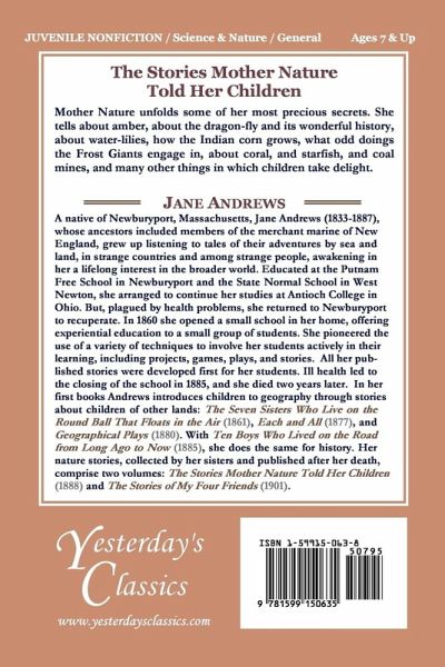 Mother Nature unfolds some of her most precious secrets. She tells about amber, about the dragon-fly and its wonderful history, about water-lilies, how the Indian corn grows, what odd doings the Frost Giants engage in, about coral, and starfish, and coal mines, and many other things in which children take delight.