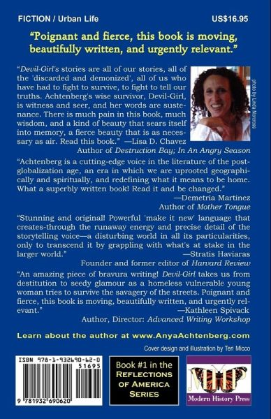 Devil-Girl is a storyteller smaller than a stain and larger than life, a mythic figure roaming the globe. Born into Brooklyn housing projects and the nightmares of her immigrant family, she becomes a runaway in the human marketplace of the streets of New York. Accompanied by her sense of outrage and sense of humor, ghosts of the ancestors and her prophetic vision, she moves from silence through rage into a deep alliance with the marginalized. "Poignant and fierce, this book is moving, beautifully written, and urgently relevant." "Devil-Girl's stories are all of our stories, all of the 'discarded and demonized', all of us who have had to fight to survive, to fight to tell our truths. Achtenberg's wise survivor, Devil-Girl, is witness and seer, and her words are sustenance. There is much pain in this book, much wisdom, and a kind of beauty that sears itself into memory, a fierce beauty that is as necessary as air. Read this book." -Lisa D. Chave, Author of Destruction Bay; In An Angry Season "Achtenberg is a cutting-edge voice in the literature of the post-globalization age, an era in which we are uprooted geographically and spiritually, and redefining what it means to be home. What a superbly written book! Read it and be changed." -Demetria Martinez, Author of Mother Tongue "Stunning and original! Powerful 'make it new' language that creates-through the runaway energy and precise detail of the storytelling voice-a disturbing world in all its particularities, only to transcend it by grappling with what's at stake in the larger world." -Stratis Haviaras, Founder and former editor of Harvard Review "An amazing piece of bravura writing! Devil-Girl takes us from destitution to seedy glamour as a homeless vulnerable young woman tries to survive the savagery of the streets. Poignant and fierce, this book is moving, beautifully written, and urgently relevant." -Kathleen Spivack, Author, Director: Advanced Writing Workshop Book #1 in the Reflections of America Series Learn about the author at www.Anya-Achtenberg.com Modern History Press www.ModernHistoryPress.com, an imprint of Loving Healing Press