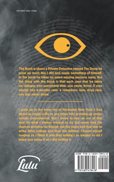 The Book is about a Private Detective named Tim Stone he grow up much like I did and made something of himself. In the book he takes on select missing persons cases, But the thing with the book is that each case that he takes on changes into something else, you never know. It may morph into a murder case, a conspiracy case, drug case, you just never know.