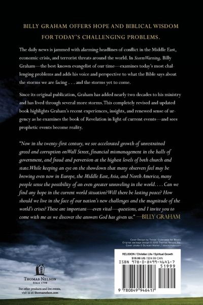 * New York Times best seller!* Billy Graham offers hope and biblical wisdom for today's challenging problems. The daily news is jammed with alarming headlines of conflict in the Middle East, economic crisis, and terrorist threats around the world. In Storm Warning, Billy Graham -- the best-known evangelist of our time -- examines today's most challenging problems and adds his voice and perspective to what the Bible says about the storms we are facing... and the storms yet to come. Since its original publication, Graham has added nearly two decades to his ministry and has lived through several more storms. This completely revised and updated book highlights Graham's experiences, insights, and renewed sense of urgency as he examines the book of Revelation in light of current events--and sees prophetic events become reality. "Now in the twenty-first century, we see accelerated growth of unrestrained greed and corruption on Wall Street, financial mismanagement in the halls of government, and fraud and perversion at the highest levels of both church and state. While keeping an eye on the showdown that many observers feel may be brewing even now in Europe, the Middle East, Asia, and North America, many people sense the possibility of an even greater unraveling in the world. Can we find any hope in the current world situation? Will there be lasting peace? How should we live in the face of our nation's new challenges and the magnitude of the world's crises? These are important--even vital--questions, and I invite you to come with me as we discover the answers God has given us." --Billy Graham