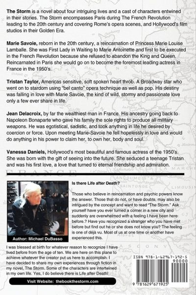 The Storm is a novel about four intriguing lives and a cast of characters entwined in their stories. The Storm encompasses Paris during The French Revolution leading to the 20th century and covers Rome's opera House scenes, and Hollywood film studios in their Golden Era. Marie Savoie, reborn in the 20th century, a reincarnation of Princess Marie Louise Lamballe. She was First Lady in Waiting to Marie Antoinette and first to be executed in the French Revolution because she refused to abandon the King and Queen. Reincarnated in Paris she would go on to become the foremost leading actress in France in the 1950's. Tristan Taylor, Americas sensitive, soft spoken heart throb. A Broadway star who went on to stardom using "bel canto" opera technique as well as pop. His destiny was falling in love with Marie Savoie, the kind of wild, stormy and passionate love only a few ever share in life. Jean Delacroix, by far the wealthiest man on earth. His ancestry going back to Napoleon Bonaparte who gave his family the sole rights to produce all military weapons. He was egotistical, sadistic, and took anything in life he desired by coercion or force. Upon meeting Marie-Savoie he fell hopelessly in love and would do anything in his power to claim her, to own her, body and soul. Vanessa Daniels, Hollywood's most beautiful and famous actress of the 1950's. She was born with the gift of seeing into the future. She seduced a teenage Tristan and was his first love, a love that turned to eternal friendship and admiration. Inspiration for The Storm The first thoughts came to me in 1955. I was attending an "audit class" about Philosophies at UCLA, an evening class. The instructor asked the audience for volunteers to experience regression in order to relive past lives, (under hypnosis). I don't know why but I raised my hand and easily was put in a deep trance. I was regressed to three previous lives but the one that changed my life was when I was taken back in time to October 5th 1789. I was a Swiss guard in charge of guarding Marie Antoinette. The Queen was playing cards with her first lady in waiting Princess Lamballe in her second-floor bedroom. I heard a loud noise in the main entry to The Petit Trianon, the Queens private residence in the forest of Versailles. I rushed down the stairs and was encountered by a mob scene, mostly women yelling "death to the queen." I put my hands up in a sign of no entry and a man holding a large metal tipped spear threw it at me. I was hit in my stomach the lance going completely though me and pinning me to the wall. What really pushed me over to write the storm came about in 1998. I was on a business trip in New Orleans. It was a Sunday and having nothing better to do noticed there was an antique show not far from my hotel. While strolling through the booths I felt a pull towards a very large glass lined series of displays showing very expensive jewelry. Among the items was one small glass display and inside one item. I stared at the black velvet box exhibiting a delicate bracelet. My body froze as the same extraordinary vision took over once again. The large crowd became silent, the colors of the entire auditorium changed to vibrant colors not of this earth. It was not until the year 2000 that I decided to write the novel you can read today. It took many years and much research to create The Storm. I wanted this fiction novel to be as accurate as possible and spent five years in the process. Keep in mind other fiction writers like James Mitchener spend enormous amounts of research time even writing a fiction novel. Writing the Storm was an act of love and I hope you find it rewarding.