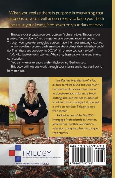 When you realize there is purpose in everything that happens to you, it will become easy to keep your faith and trust your loving God, even on your darkest days. Through your greatest sorrows, you can find many joys. Through your greatest "knock downs," you can get up and become much stronger. Through your greatest struggles, you can have the most amazing victories. Many people sit around and reminisce about things they wish they could do. Then there are people who DO. Which one do you want to be? We ALL face our own storms. When they happen, we have one choice--our reaction. You can choose to pause and smile, knowing God has you. This book will help you work through your storms and show you how to be victorious.