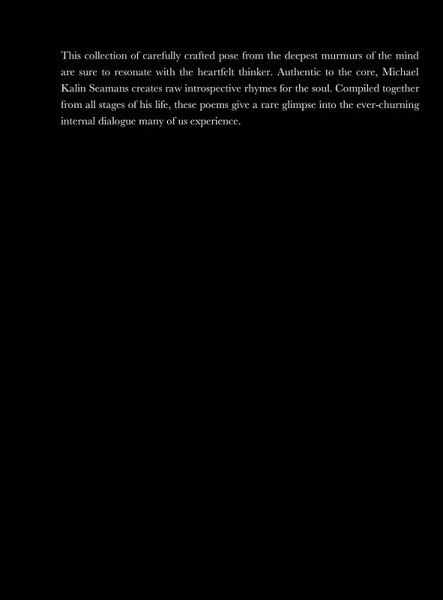 This collection of carefully crafted pose from the deepest murmurs of the mind are sure to resonate with the heartfelt thinker. Authentic to the core, Michael Kalin Seamans creates raw introspective rhymes for the soul. Compiled together from all stages of his life, these poems give a rare glimpse into the ever-churning internal dialogue many of us experience. Take in piece by piece or read it straight through, throughout you will enjoy the Authors unapologetic outpouring.
