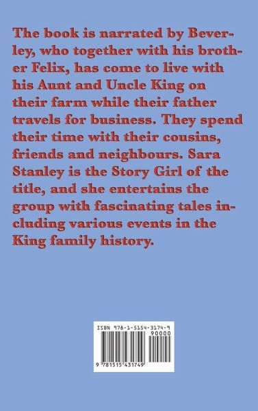The book is narrated by Beverley, who together with his brother Felix, has come to live with his Aunt and Uncle King on their farm while their father travels for business. They spend their time with their cousins, friends and neighbours. Sara Stanley is the Story Girl of the title, and she entertains the group with fascinating tales including various events in the King family history.