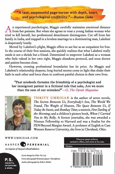 An experienced psychologist, Maggie carefully maintains emotional distance from her patients. But when she agrees to treat a young Indian woman who tried to kill herself, her professional detachment disintegrates. Cut off from her family in India, and trapped in a loveless marriage to a domineering man, Lakshmi is desperately lonely. Moved by Lakshmi's plight, Maggie offers to see her as an outpatient for free. In the course of their first sessions, she quickly realizes that what Lakshmi really needs is not a shrink but a friend. Determined to empower Lakshmi as a woman who feels valued in her own right, Maggie abandons protocol, and soon doctor and patient become close. However, crossing professional boundaries has its price. As Maggie and Lakshmi's relationship deepens, long-buried secrets come to light that shake their faith in each other and force them to confront painful choices in their own lives.