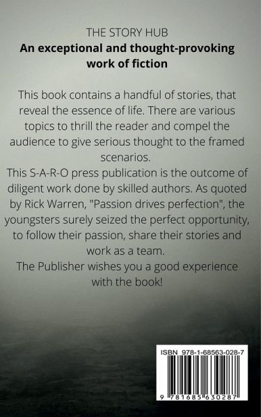 THE STORY HUB An exceptional and thought-provoking work of fiction This book contains a handful of stories, that reveal the essence of life. There are various topics to thrill the reader and compel the audience to give serious thought to the framed scenarios. This S-A-R-O press publication is the outcome of diligent work done by skilled authors. As quoted by Rick Warren, ""Passion drives perfection"", the youngsters surely seized the perfect opportunity, to follow their passion, share their stories and work as a team. The Publisher wishes you a good experience with the book!