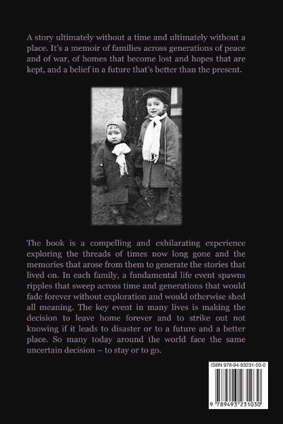 A memoir ultimately without a time and ultimately without a place. It's a story of families across generations of peace and of war, of homes that become lost and hopes that are kept, and a belief in a future that's better than the present. The memoir is a compelling and exhilarating experience exploring the threads of times now long gone and the memories that arose from them to generate the stories that lived on. In each family, a fundamental life event spawns ripples that sweep across time and generations that would fade forever without exploration and would otherwise shed all meaning. The key event in many lives is making the decision to leave home forever and to strike out not knowing if it leads to disaster or to a future and a better place. So many today around the world face the same uncertain decision - to stay or to go.