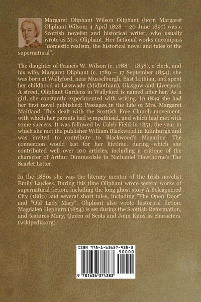 Margaret Oliphant Wilson Oliphant (born Margaret Oliphant Wilson; 4 April 1828 - 20 June 1897) was a Scottish novelist and historical writer, who usually wrote as Mrs. Oliphant. Her fictional works encompass "domestic realism, the historical novel and tales of the supernatural". The daughter of Francis W. Wilson (c. 1788 - 1858), a clerk, and his wife, Margaret Oliphant (c. 1789 - 17 September 1854), she was born at Wallyford, near Musselburgh, East Lothian, and spent her childhood at Lasswade (Midlothian), Glasgow and Liverpool. A street, Oliphant Gardens in Wallyford is named after her. As a girl, she constantly experimented with writing. In 1849 she had her first novel published: Passages in the Life of Mrs. Margaret Maitland. This dealt with the Scottish Free Church movement, with which her parents had sympathised, and which had met with some success. It was followed by Caleb Field in 1851, the year in which she met the publisher William Blackwood in Edinburgh and was invited to contribute to Blackwood's Magazine. The connection would last for her lifetime, during which she contributed well over 100 articles, including a critique of the character of Arthur Dimmesdale in Nathaniel Hawthorne's The Scarlet Letter. In the 1880s she was the literary mentor of the Irish novelist Emily Lawless. During this time Oliphant wrote several works of supernatural fiction, including the long ghost story A Beleaguered City (1880) and several short tales, including "The Open Door" and "Old Lady Mary". Oliphant also wrote historical fiction. Magdalen Hepburn (1854) is set during the Scottish Reformation, and features Mary, Queen of Scots and John Knox as characters. (wikipedia.org)
