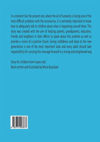 In a moment like the present one, where the all of humanity is facing one of the most difficult problems with the coronavirus, it is extremely important to know how to adequately talk to children about what is happening around them. This story was created with the aim of helping parents, grandparents, educators, friends and neighbors in their efforts to speak about this problem as well as provide a vision of a positive future. Giving confidence and hope to the new generations is one of the most important tasks and every adult should take responsibility for carrying this message forward in a strong and enlightened way. Story for children from 4 years-old.Book written and illustrated by Moira Buzzolani
